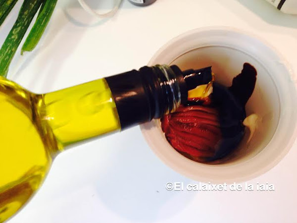 y un chorrito de aceite de oliva virgen, batimos muy bien hasta que quede una crema