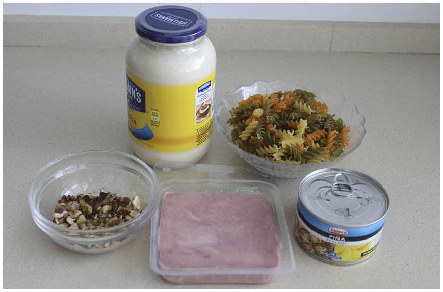 2.- Mientras se cuece la pasta, troceamos el jamón y la piña. Una vez hecha la pasta, la ponemos en un escurridor para eliminar el agua y la refrescamos con agua fría para enfriarla. La ponemos bien escurrida en un bol junto al jamón, la piña, las nueces y la mayonesa. Mezclamos y guardamos en el frigorífico, o lo consumimos al momento.