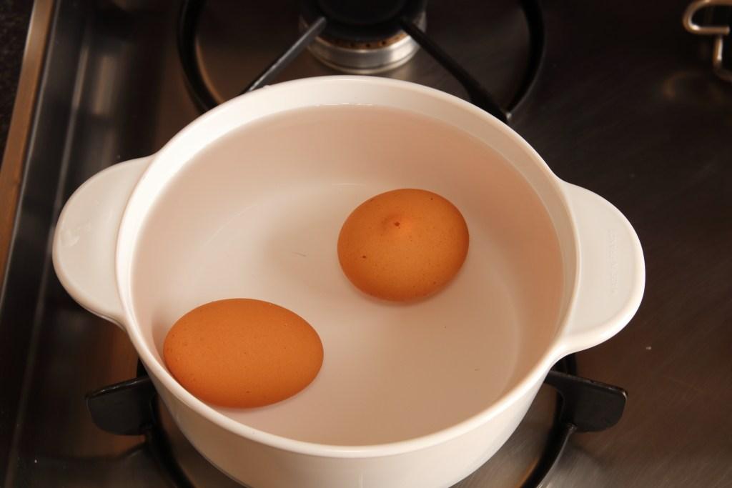 Cocemos los huevos, enteros y con cáscara en agua durante 10 minutos desde que comienza a hervir. Una vez cocidos pasamos por agua fría, dejamos templar y cuando se enfríen los pelamos, separamos las yemas de las claras y reservamos.