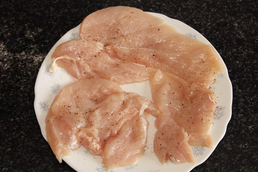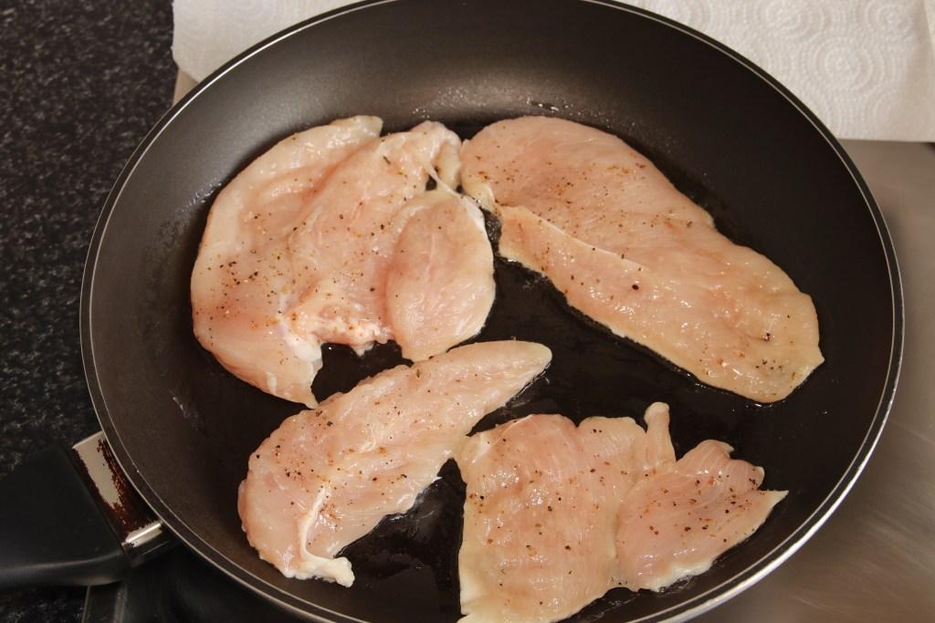 Salpimentamos y cortamos en filetes la pechuga de pollo, la cocinamos a la plancha, cortamos en trocitos y la añadimos a la pasta.