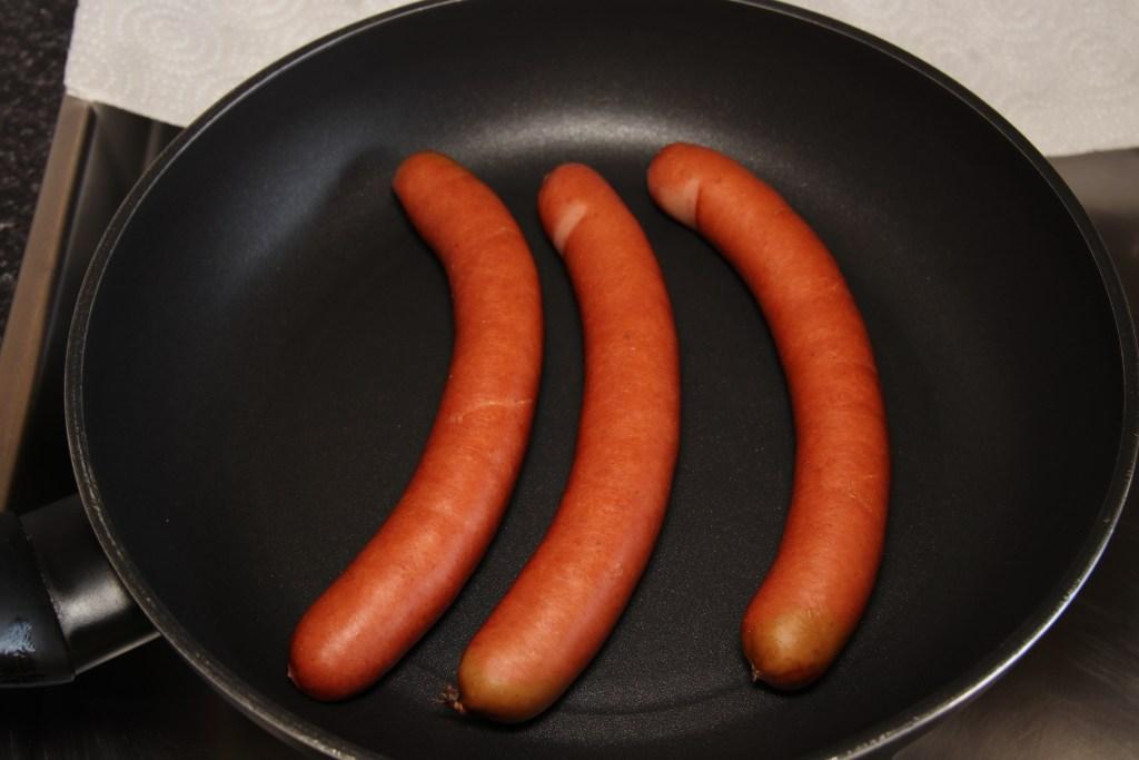 Ponemos una sartén a fuego medio y echamos las salchichas, las doramos por sus caras, retiramos del fuego y troceamos en rodajas no demasiado grandes.