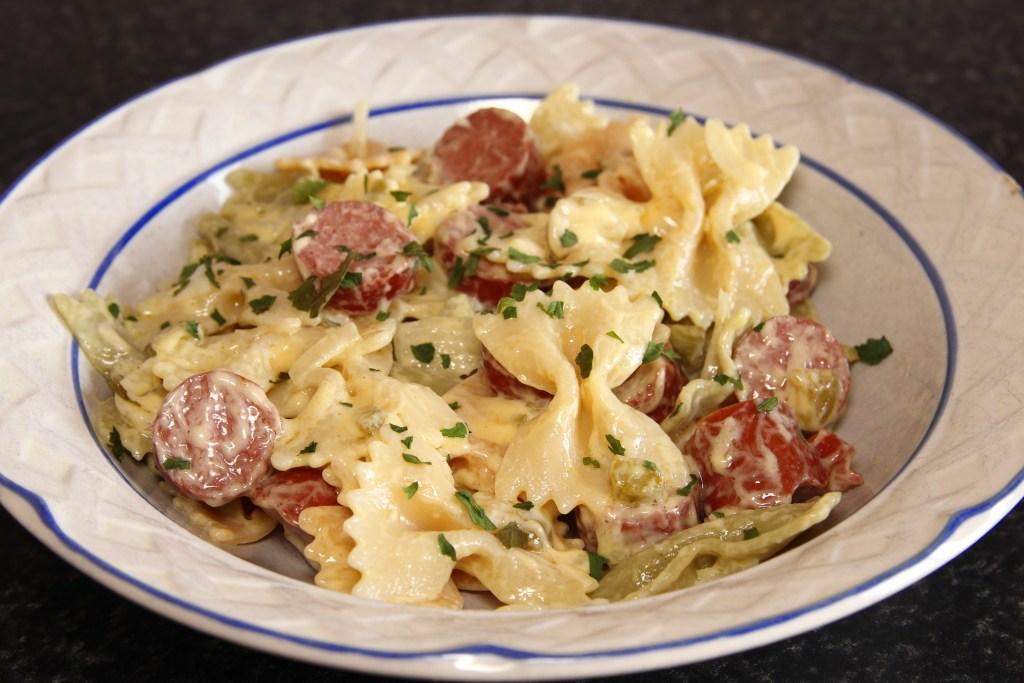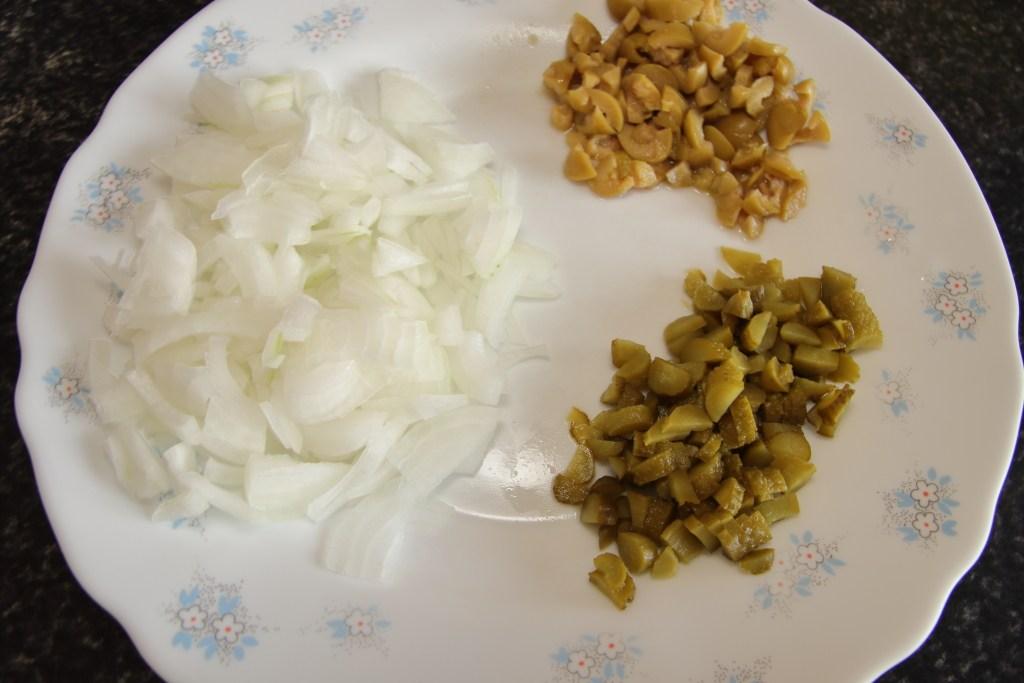 Lavamos y picamos finamente la cebolleta, las aceitunas y los pepinillos. Incorporamos todo, junto con las salchichas, a la pasta.