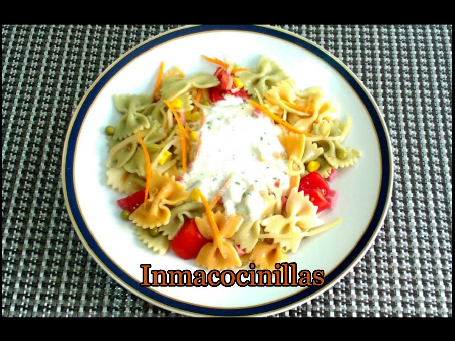 Cocer la pasta según el paquete , mientras hacer la salsa mezclando el yogur con la mahonesa y añadiendo el cebollino bien picado , perejil bien picado , eneldo bien picado , la pizca de ajo en polvo , la pizca de cebolla en polvo , la pizca de pimienta molida y un poquito de sal , conservar en frío .