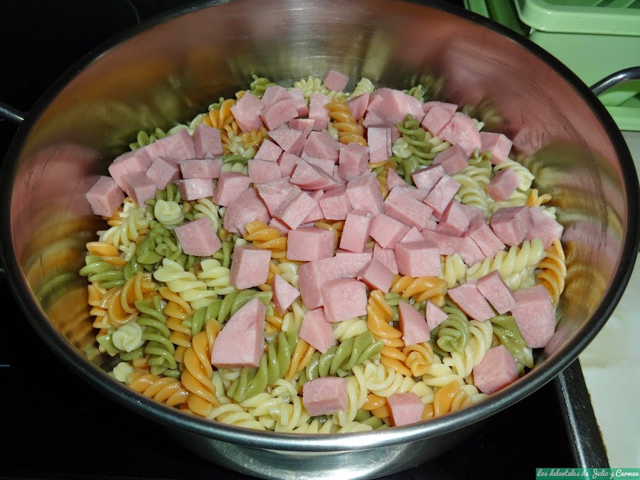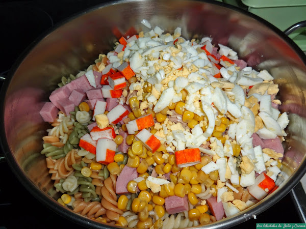 Partiremos el jamón de york y los palitos de cangrejo en cuadraditos y verteremos encima de la pasta. También echaremos encima la lata de atún escurrida y desmigada y el maíz que deseemos.