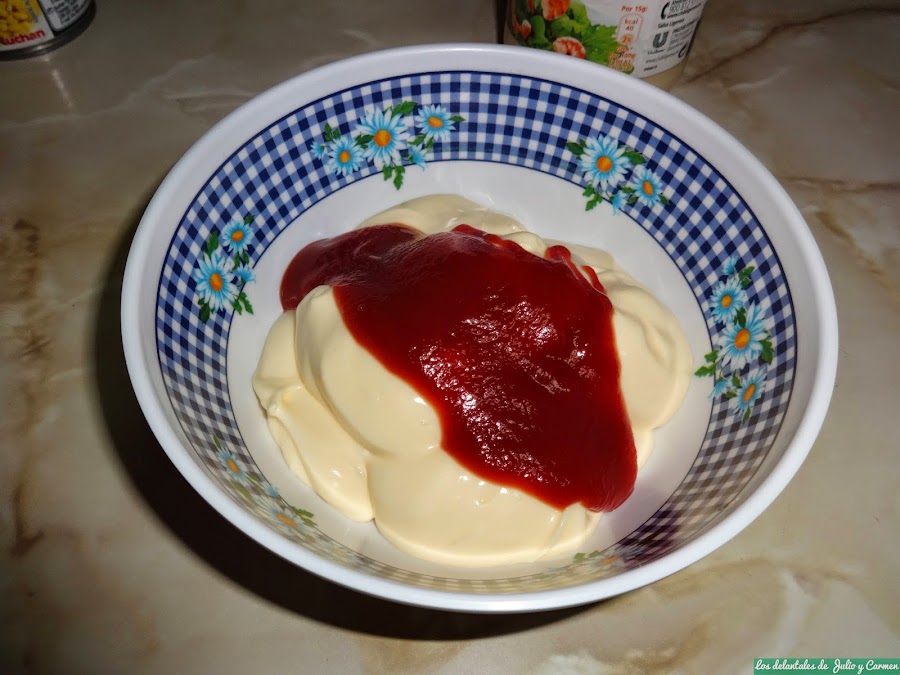 Para hacer la salsa, vertemos la mahonesa y el ketchup en un cuenco y removemos. Cuando lo tengamos bien unido, echamos la cucharada de zumo de naranja y la media de ron y continuamos removiendo para que se integren bien todos los sabores.