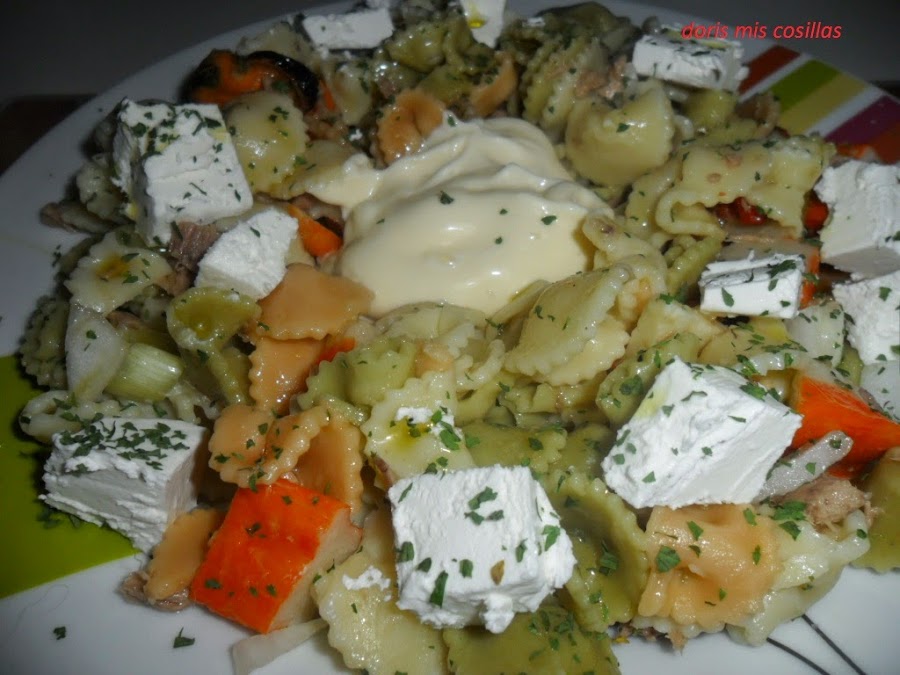 Escurrimos la lata de atún y mejillones ,rallamos la cebolleta, cortar en pequeños dados el queso feta y los palitos de cangrejo. Acomodamos en una fuente la pasta reservada y agregamos todos los ingredientes mencionados, rociamos con un hilo de aceite y sal, remover con cuidado.