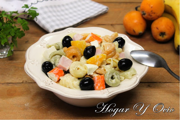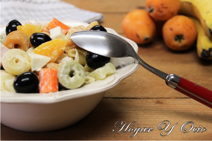 4. Mezclamos la pasta con el resto de ingredientes y aliñamos con mayonesa. Os recomiendo que no pogáis demasiasa salsa en el aliño para no enmascarar los sabores de los demás ingredientes.