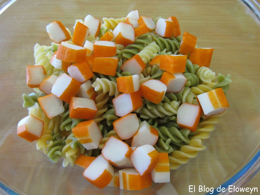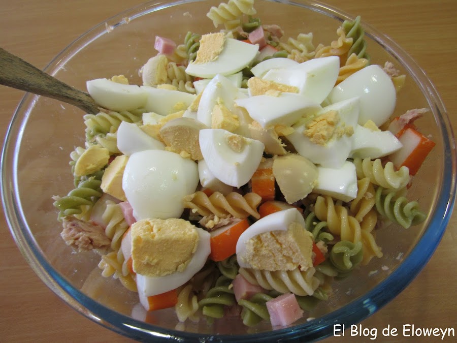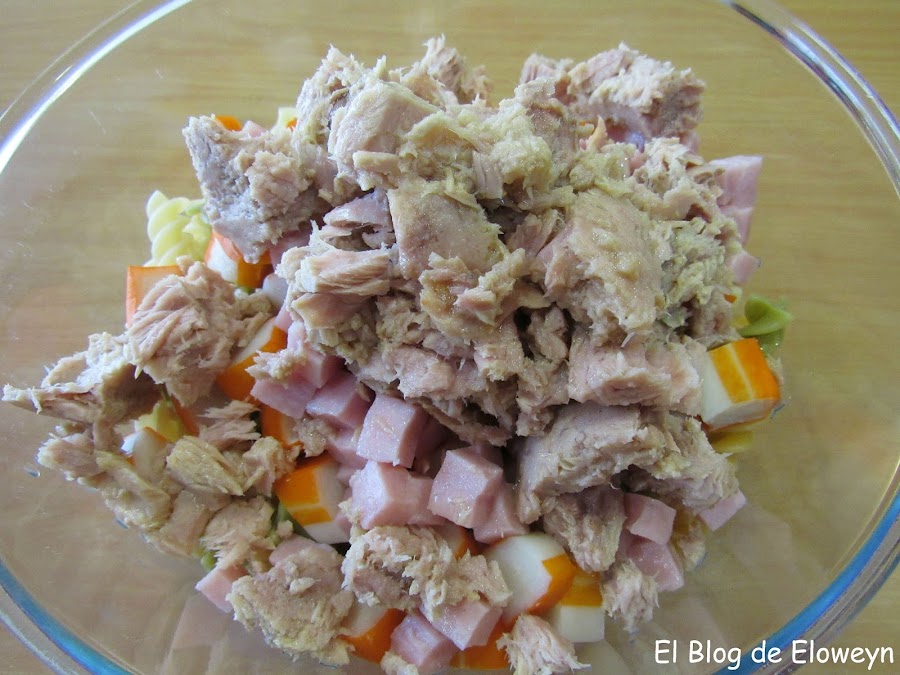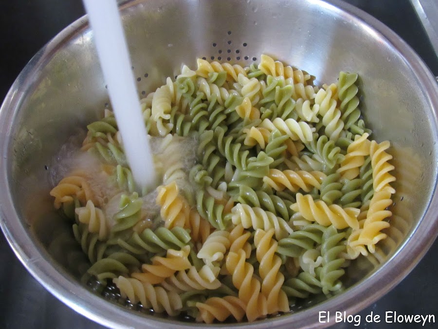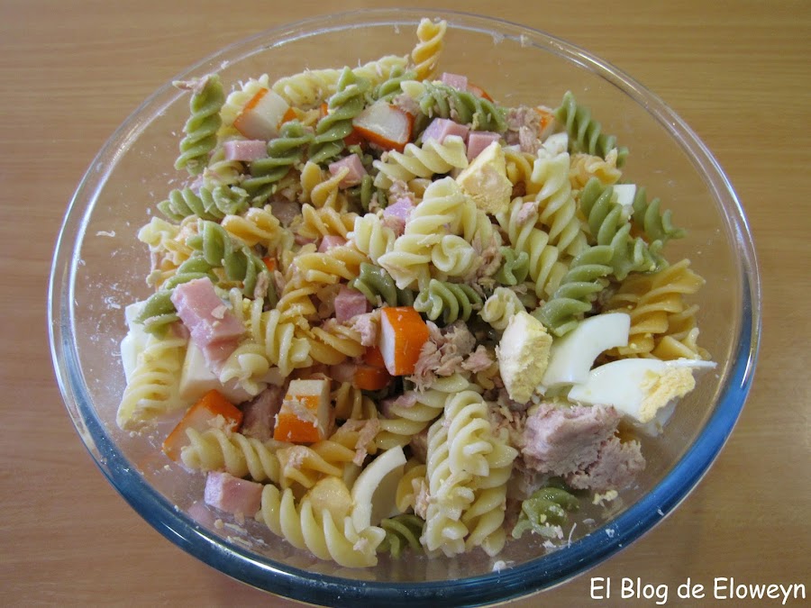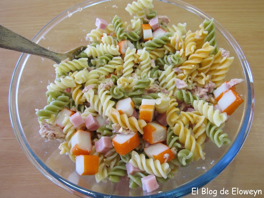 Hace muchos años que hacemos este plato en casa. No sé por qué le pusimos de nombre "ensalada de pasta". Lo de "ensalada de pasta" es un decir, porque lo que es verdura, no lleva nada, Bueno, en este caso, la pasta de colores sí que lleva algo...pero normalmente usamos espirales normales, sin color. Da igual. Lleve la pasta que lleve, ¡está buenísima!... jajaja. Supongo que le pusimos "ensalada de pasta" porque este plato se come frío, y con este calor, sienta de maravilla.