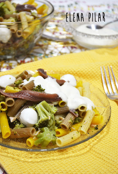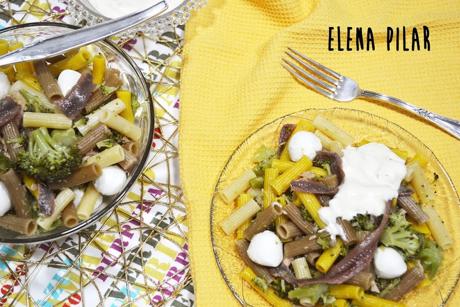 Ensalada de pasta y brócoli, con salsa de yogur: