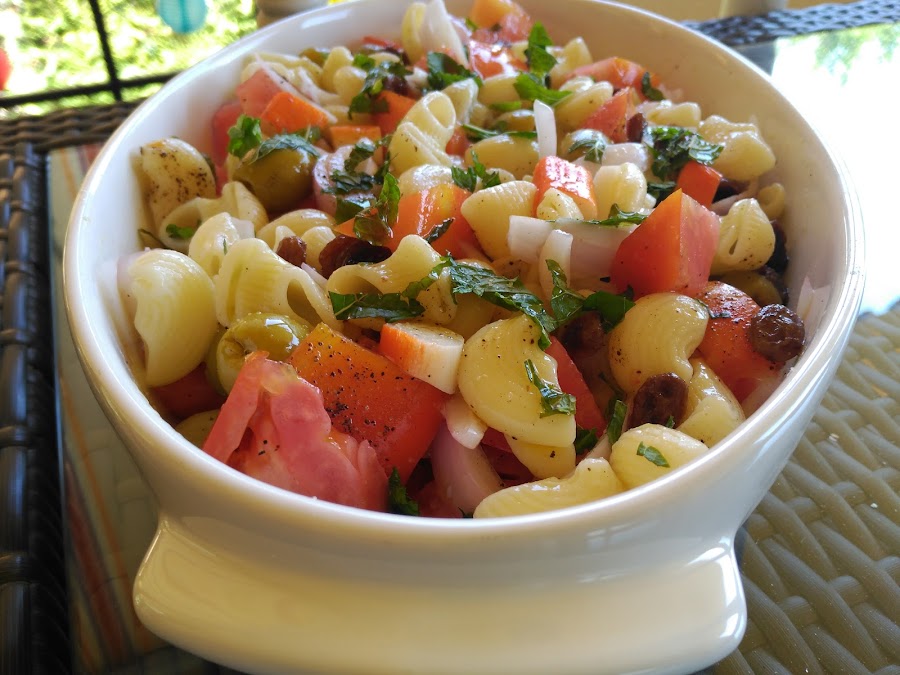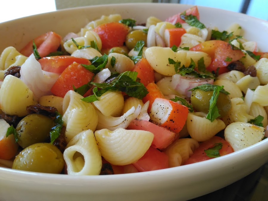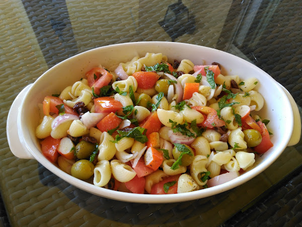 - Escurrir las pasas y las aceitunas, y añadirlas a la ensaladera, regar con aceite, vinagre y sal, y remover bien.