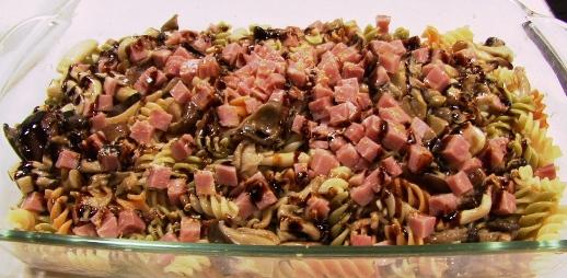 Para montar la ensalada, ponemos la pasta en el plato o fuente en el que vayamos a servir la ensalada. Añadimos los champiñones, enteros o laminados, eso a nuestro gusto, y aliñamos con 2 cucharadas de aceite y el vinagre al gusto, poniendo por encima las tiras de jamón cortado en juliana. Si queremos ponerle la guinda al pastel, podemos cortar unas fresas y esparcirlas por la ensalada.