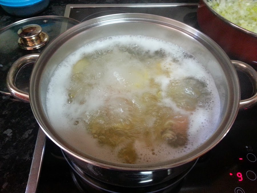 Mientras, ponemos agua a calentar. Ponemos los huevos dentro y cuando rompa a hervir, agregamos la pasta y mantenemos el tiempo que se indica en el envase.