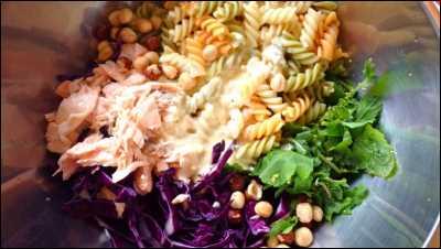 Rociamos nuestra ensalada de pasta y salmón con la vinagreta, mezclamos muy bien para que quede bien impregnada y ya la tenemos a punto para servir.
