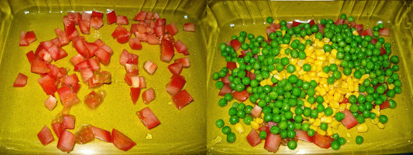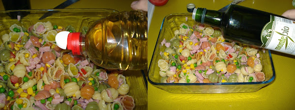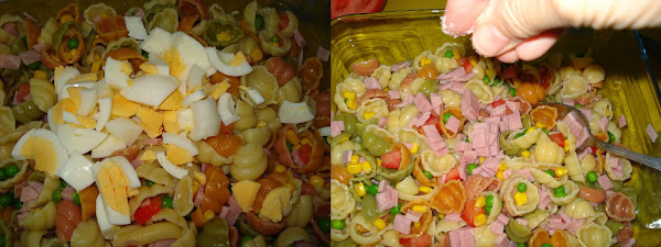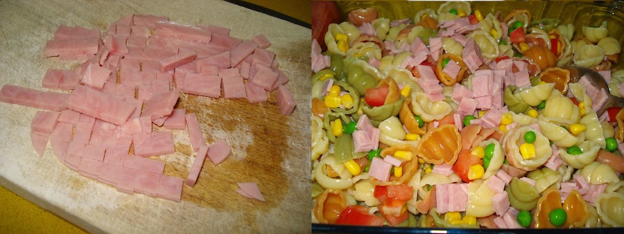 Añadimos a la pasta el huevo, los guisantes, el maíz, el tomate, el jamón y lo mezclamos todo.