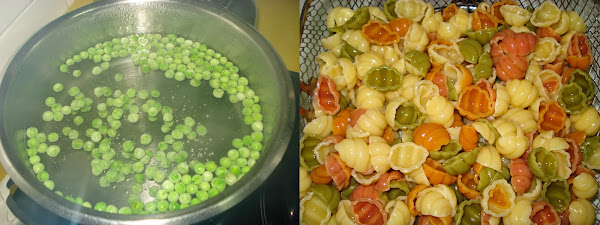Cuando la pasta esté en su punto la vertemos en un colador grande y la pasamos por agua fría para romper la cocción y evitar que se pegue. Reservamos en un bol o fuente grande.