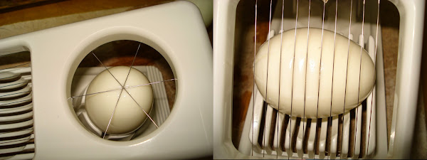 Cuando los huevos estén cocidos los pasamos por agua fría, los pelamos y picamos en trocitos pequeños, nosotras no ayudamos de un cortador de huevos, primero los cortamos en un sentido, cogemos con cuidado el huevo para que no se desmonte y lo colocamos para cortar en el otro sentido.