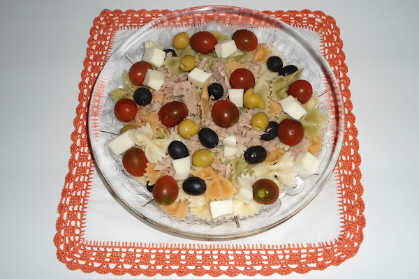 Se cuece la pasta con una pizca de sal, cuando este se echa escurre para que no quede nada de agua, se deja enfriar un poco y se aliña con el aceite, vinagre y sal, y añadimos los demás ingredientes.