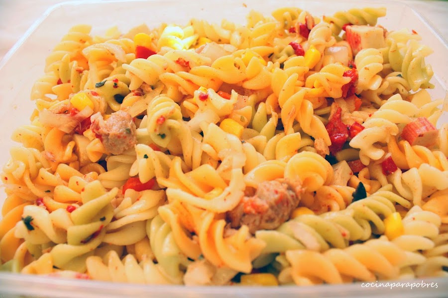 Pelamos y picamos la cebolla, troceamos los palitos de cangrejo, troceamos las aceitunas, los pimientos, mezclamos con la pasta, maíz y u na lata de atún.