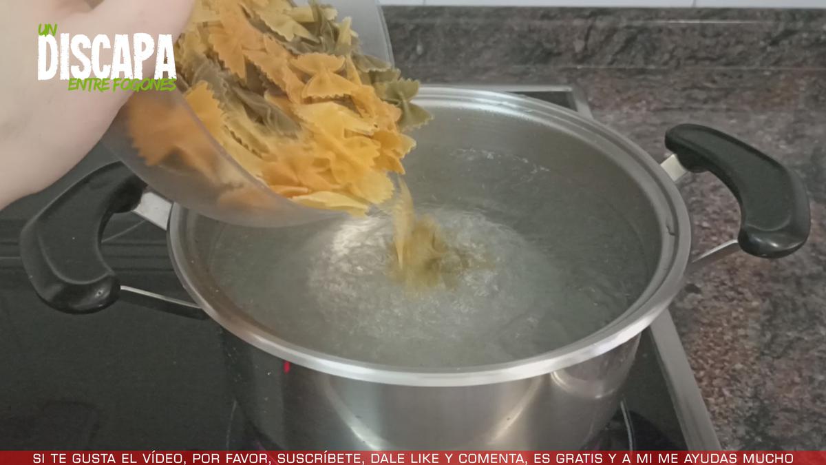 2Una vez que ya hemos cocido los huevos, vamos a cocer la pasta, para ello, en una cazuela ponemos abundante agua a hervir, ponemos pizca de sal y añadimos la pasta. Removemos y coceremos la pasta el tiempo que nos indique el fabricante.