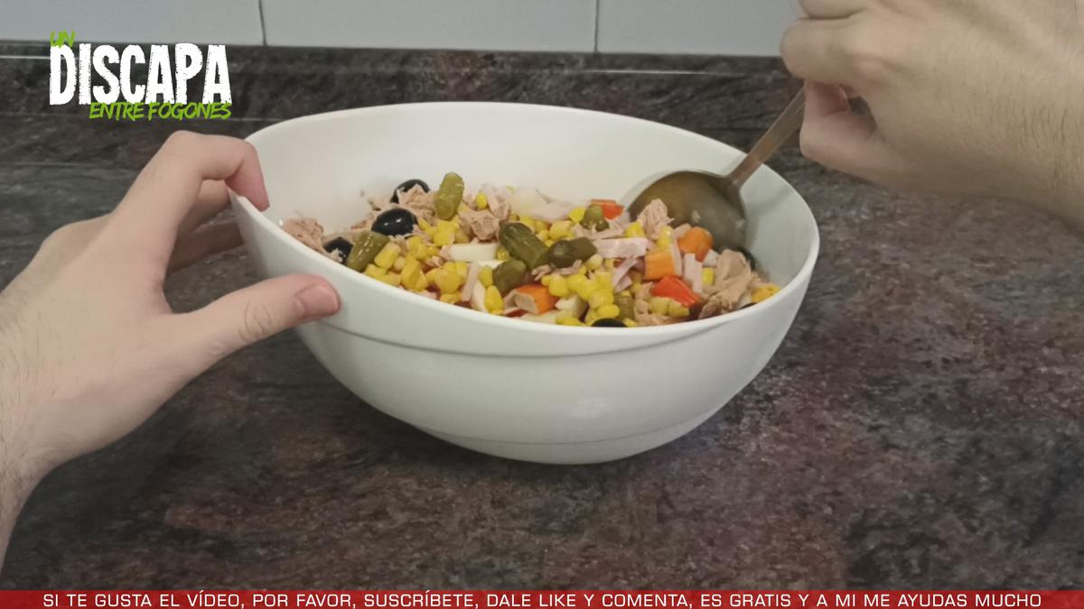 3Mientas se cuece la pasta, vamos a ir troceando los demás ingredientes. Aquí tengo unas cuñas de queso que voy a trocear en daditos pequeños. A medida que vamos troceando los ingredientes los vamos dejando en el recipiente donde haremos la ensalada. Ahora troceamos unos palitos de cangrejo o surimi en pedazos ni muy grandes ni muy pequeños. Aquí tengo 2 lonchas de pavo, son lochas de unos 2 o 3 milímetros de grosor. Las trocearemos en unos cuadraditos ni muy grandes ni muy pequeños. Ahora vamos a trocear los huevos que habíamos cocido anteriormente. Le añadimos también una lata de maíz dulce bien escurrida. También le ponemos unas aceitunas negras. Partimos por la mitad unos pepinillos encurtidos y los incorporamos junto con el resto de ingredientes. También 2 latas de atún bien escurridas. Y mezclamos bien todos los ingredientes.