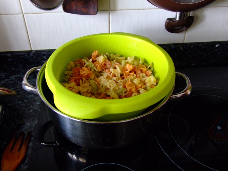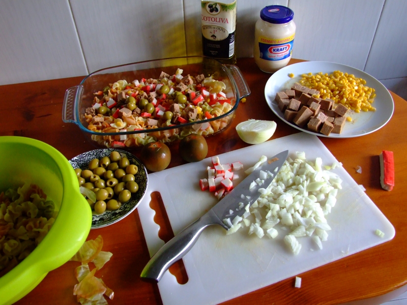 Cocemos la pasta un par e horas antes, escurrimos y la metemos en la nevera...