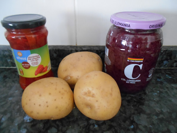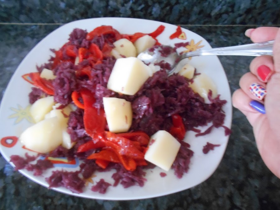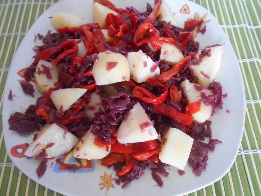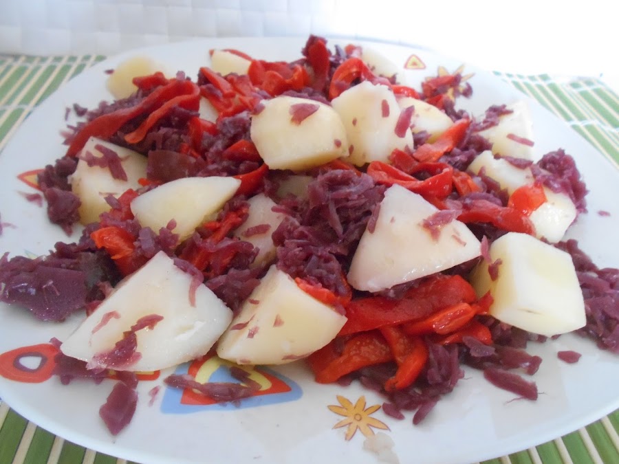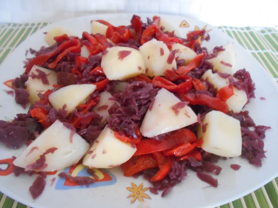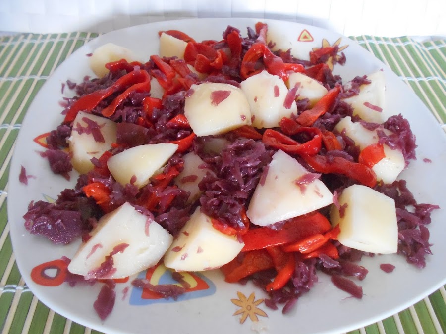 Hoy os comparto esta ensalada totalmente vegetariana especial para aquellos que teneis una dieta que siga esa linea. En esta ocasion es de col lombarda, patatas y pimientos. Queda super rica tanto en frio como templada esta ensalada.
