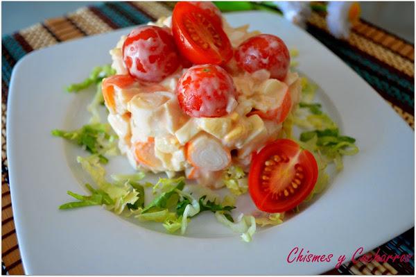 Ya tenemos fríos los huevos y las patatas, lo pelamos todo y cortamos en trozos pequeños, colocar en un bol, junto con los palitos de cangrejo también cortados en trozos pequeños añadir la salsa y mezclar. Colocar en cada plato con un aro de emplatar. Colocar los tomatitos y servir frío.