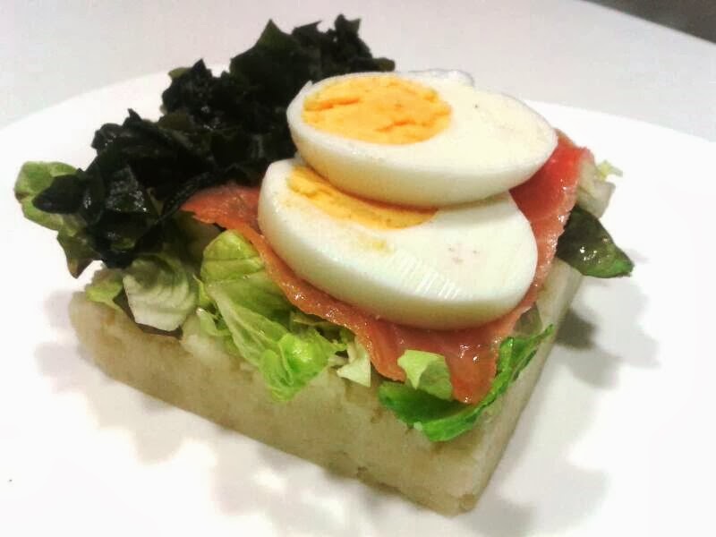 4º Añadir en un molde y como aparece en la imagen añadir la lechuga troceada, el salmón, el huevo duro y las algas hidratadas.