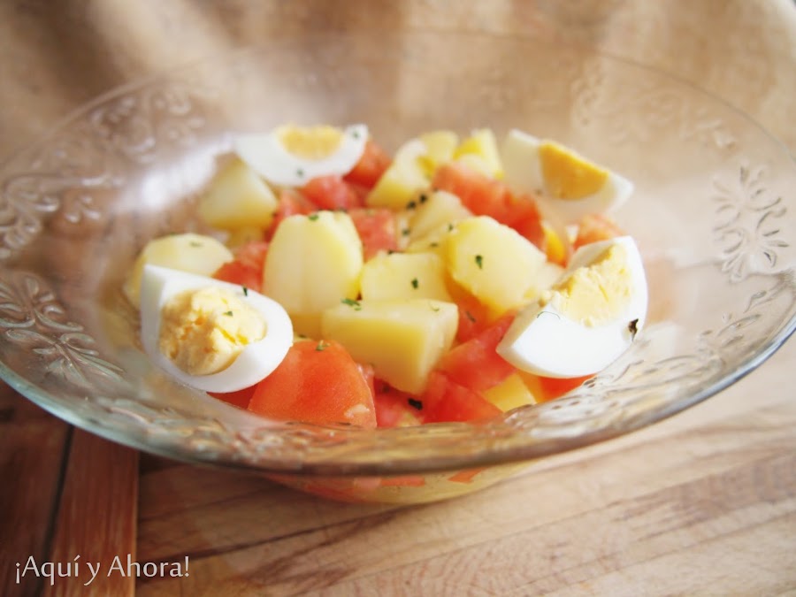Esta ensalada de patatas es muy fácil de hacer y de ingredientes sencillos, pero me trajeron unos tomates de campo deliciosos, hacía mucho tiempo que no me comía un tomate tan carnoso y con sabor a ¡¡¡TOMATE!!! Vivo en la ciudad y comprarlos así es bastante difícil... así que pensé en hacer esta ensalada de patata con pocos ingredientes, no quería quitarles el protagonismo a estos deliciosos tomates. Además es perfecta para llevar al campo, a la playa o de picnic... Os recuerdo que el lunes hay reto, si si, el reto Tía Alia!! me decanté por la receta salada ya veréis que maravilla de plato lleno de sabores!!!