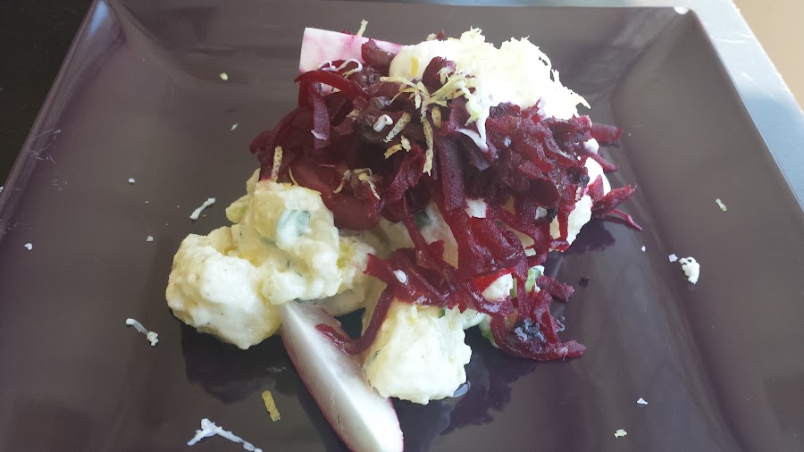 Para montar la ensalada pondremos en un bol las patatas y le añadiremos la salsa de yogurt, mezclaremos bien e introduciremos el apio. Colocamos las patatas sobre un plato de presentación, Sobre esta dos o tres gajos de rabanito, ponemos un poco de la remolacha rallada, una cucharada del yogurt griego encima de esta y espolvoreamos con la sal maldon y la ralladura de limón, unas gotas de aceite de oliva y un poco de la clara de huevo rallada. Si lo deseamos tambien podremos añadir un poco de pimeinta negra molida.