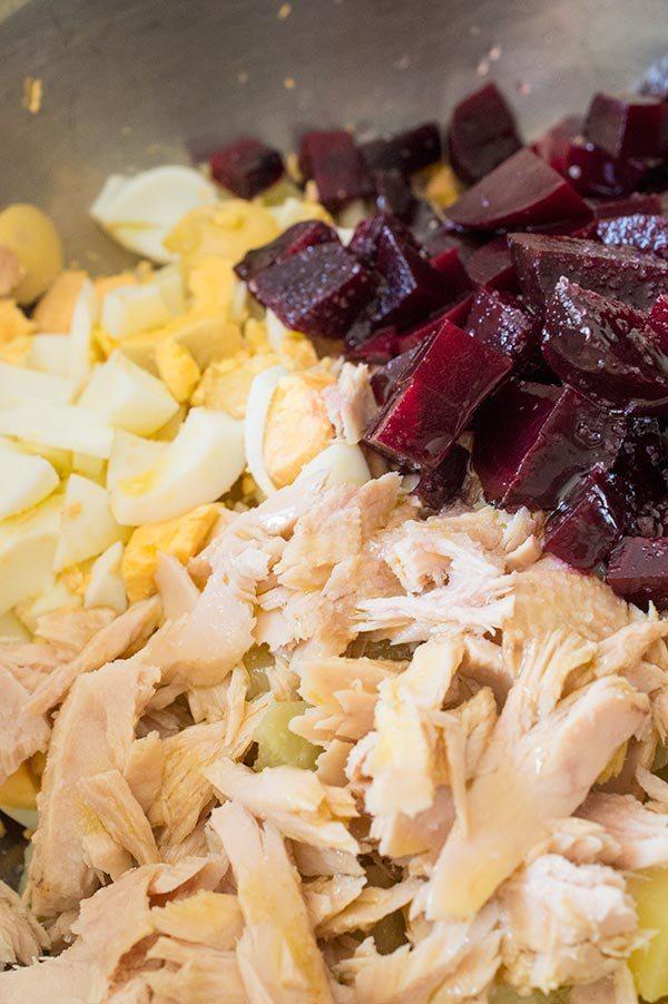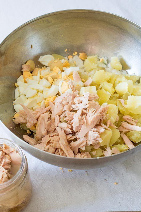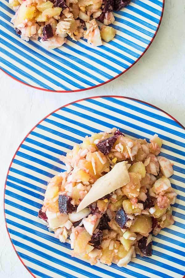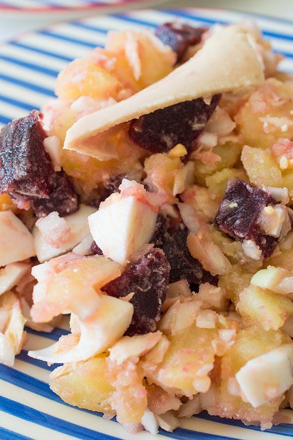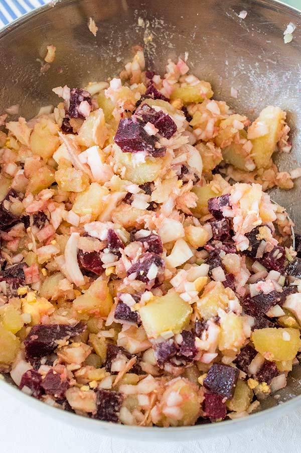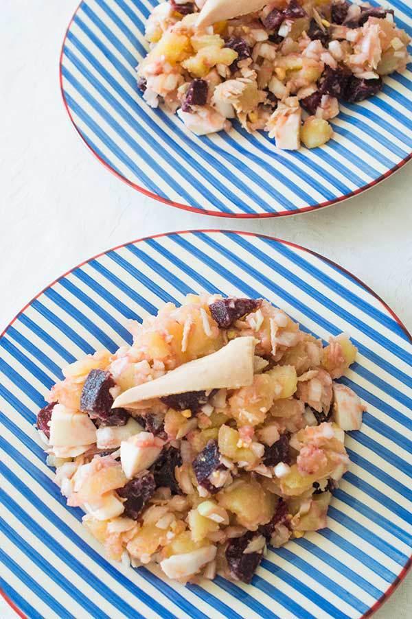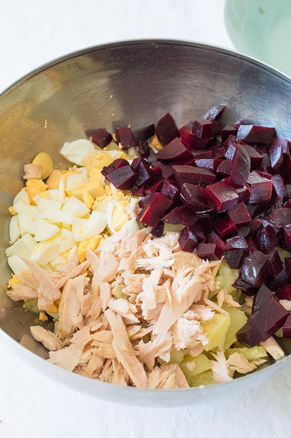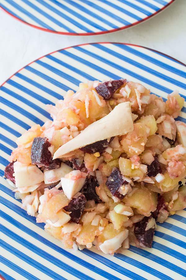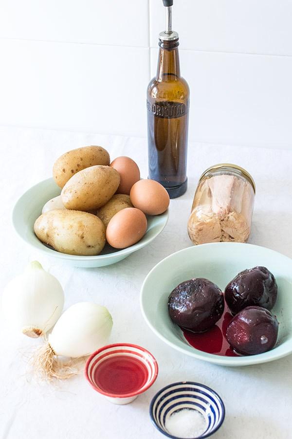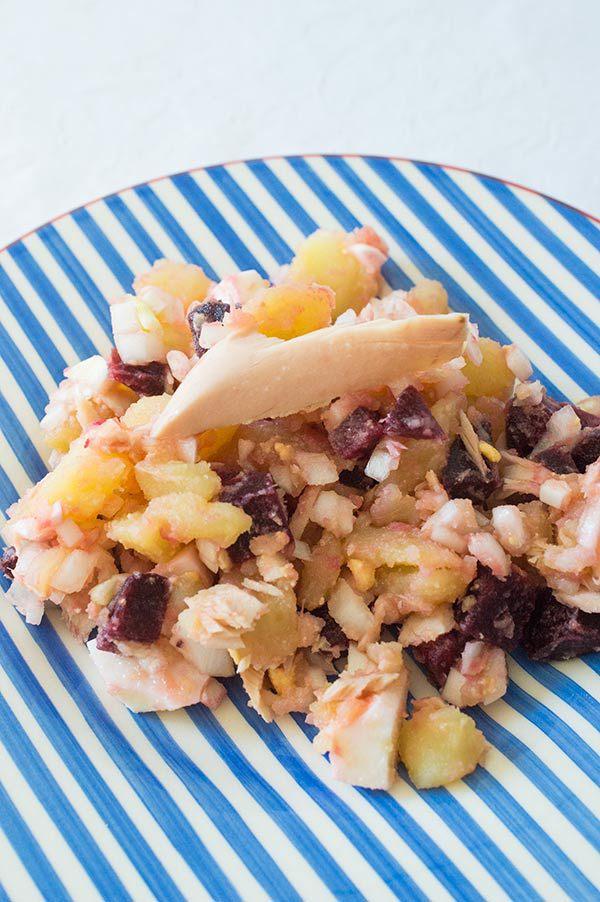 La ensalada de patata y remolacha es un clásico de toda la vida y sin duda podría formar parte del apartado de comida viejuna, pero es que esta muy buena y ademas con el buen tiempo lo que mas me apetece es comer ensaladas! He usado remolacha ya cocida, pero sin duda si tenéis oportunidad de usarlas frescas mejor que mejor, lo que pasa que ya en la primavera no están de temporada y son mas difíciles de conseguir, yo desde luego no las he encontrado! El sabor dulce de este tubérculo combina a la perfección con el bonito y la cebolleta… he usado vinagre de vino tinto que me gusta mucho en ensaladas de patata y por supuesto unos lomos de bonito ricos y no bonito de lata, que la verdad en este tipo de ensaladas se nota mucho!