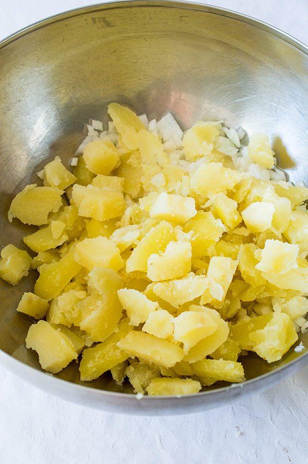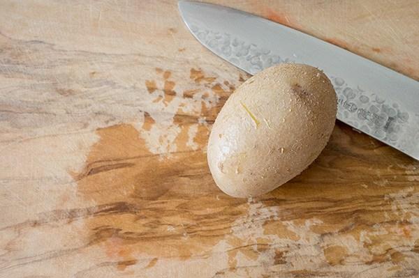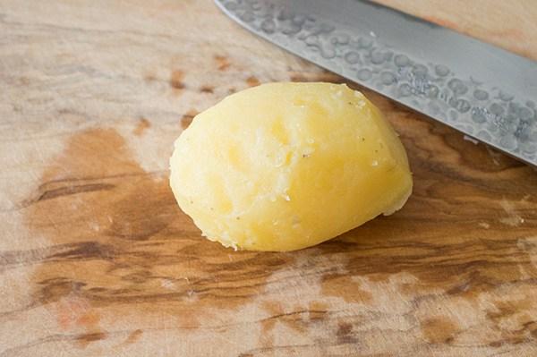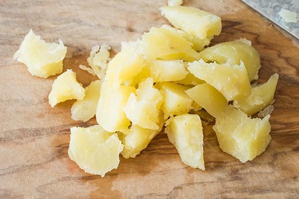 Dejamos enfriar un poco las patatas para poderlas pelar y las partimos en trozos medianos.
