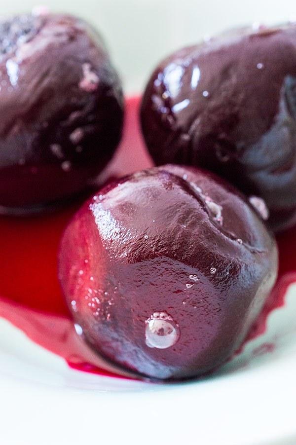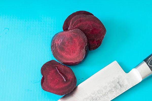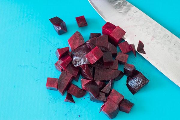 Troceamos las remolachas, he usado una tabla de plástico para no teñir mi tabla de madera.