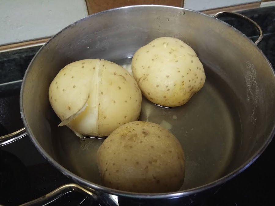 Bueno la receta no tiene más misterio que hervir 2 patatas grandes bien lavadas con piel y con un corte a la mitad en agua con un buen pellizco de sal unos 20-25 minutos según lo grandes que sean, en cuanto las pinches en el centro y no ofrezcan resistencia están buenas. Por otro lado hervimos 2 huevos unos 10 minutos para que estén duros. Para confitar los pimientos se pone medio bote de tiras de piquillo en una sartén con un chorrito de aceite de oliva y sal, cuando lleven unos minutos se le pone una cucharada de azúcar moreno y se baja el fuego y se confitan unos minutos más.