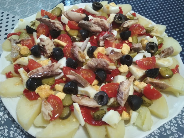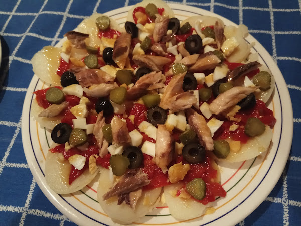 Y esto es todo lo que tenemos que cocinar ahora ya se monta, en la base del plato pondremos las patatas peladas y a rodajas gruesas, sobre ellas las tiras de pimientos confitados, pelaremos los huevos y los cortaremos sobre lo que ya tenemos en el plato y por encima la caballa desmigada en trozos vistosos, las aceitunas partidas por la mitad, los pepinillos a rodajitas y si os gusta algo más tipo frutos secos, yo no le pongo.