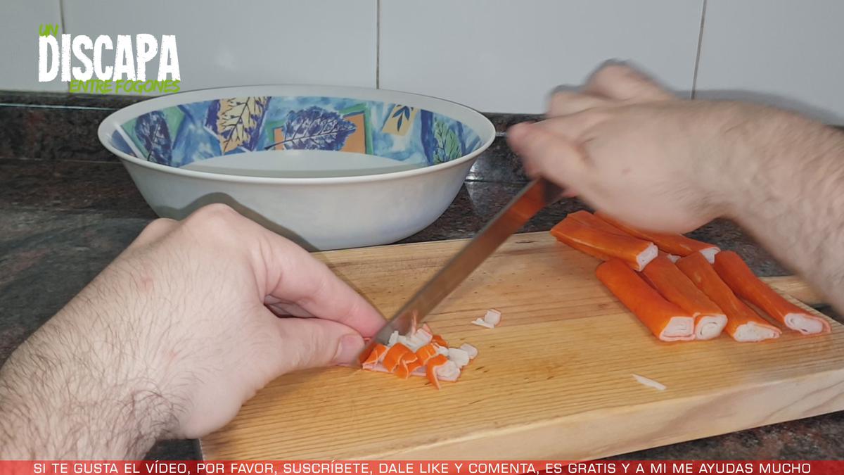 2Mientras se van cociendo, vamos a trocear el surimi o palitos de cangrejo en trocitos pequeños y los vamos dejando en un recipiente amplio.