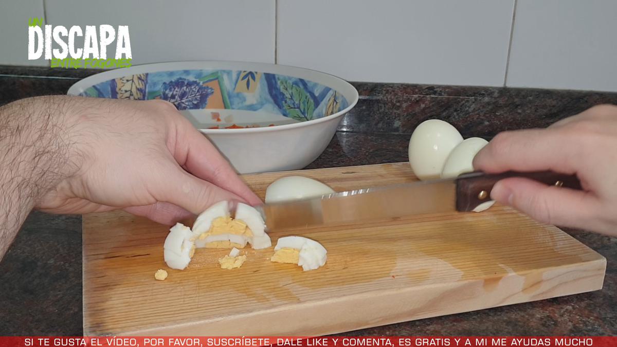 3Cuando los huevos ya se han cocido, los pelamos y también los troceamos en pedazos pequeños. Reservamos junto al surimi.
