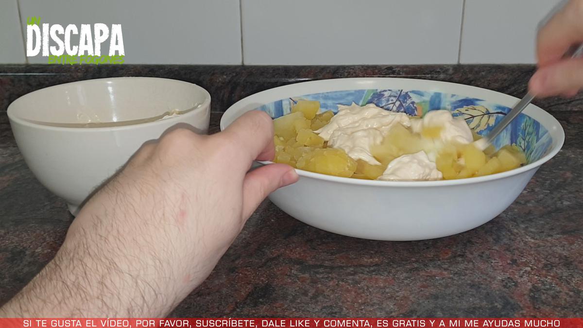 5Aquí tengo unas 5 cucharadas de mayonesa casera, si queréis saber como preparar una mayonesa os dejo por aquí arriba la receta. Añadimos la mayonesa junto con la patata, los huevos y el surimi y mezclamos bien. La metemos en la nevera para que esté fresquita.