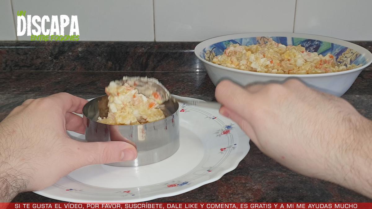 6Aquí tengo un molde para emplatar. Si no tenéis un molde de estos no pasa nada, solamente es para que el emplatado quede más bonito. Ponemos la ensalada dentro del molde y desmoldamos.
