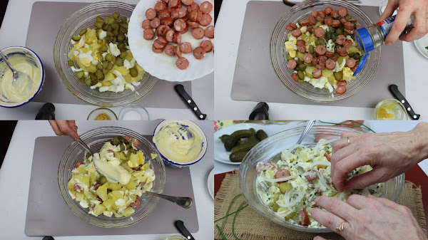 En un bol, ponemos las patatas, los huevos picados, los pepinillos, el cebollino picadito, las salchichas en rodajas, le ponemos un poquito de sal y pimienta molida y la salsa de mayonesa.