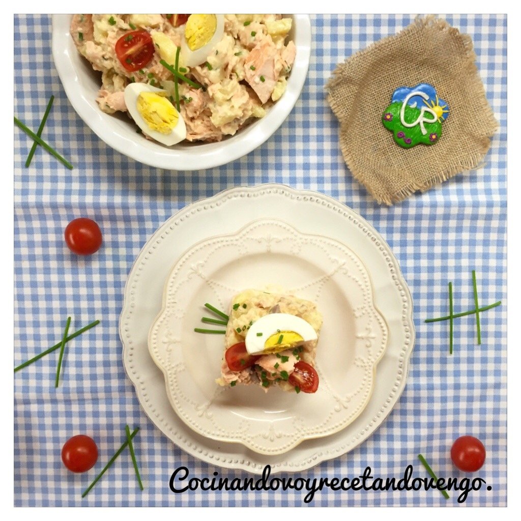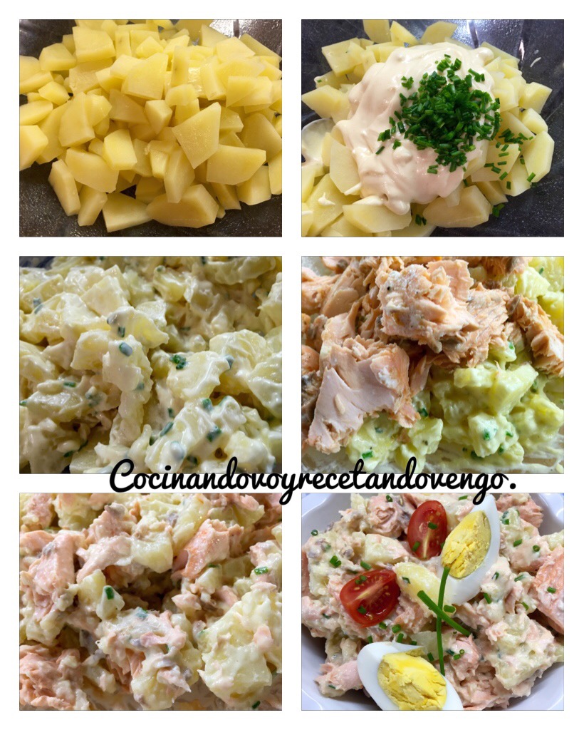 Hola a tod@s!! Esta ensalada de patatas es una maravilla, yo la descubrí hace muchos años cuando tenía unos 18 años en una boda en la que había un amplio surtidos de ensaladas (Meliá Marbella) y aunque la que yo probé era la conocida kartoffelsalat que además de patatas lleva salchichas, con los años fui versionándola con ingredientes múltiples y esta es la más deliciosa a mi gusto, el salmón le da un toque elegante, delicioso y saludable que para nada es comprable al de las salchichas y combina genial con la salsa de mostaza y mahonesa, pero siempre hay ocasiones en las que se puede hacer para los más pequeños de la casa por ejemplo o en una barbacoa con amigos. Como buena ensalada de patatas que es, admite un sin fin de variantes: surimi, alcaparras, aceitunas, gambas y un largo etc. También os aconsejo que probéis con salmón ahumado troceado :D y así eliminamos el horno, quedando igualmente irresistible ;)