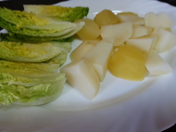 En una fuente o bandeja, ponemos las patatas y los cogollos cortados en cuatro trozos cada uno.