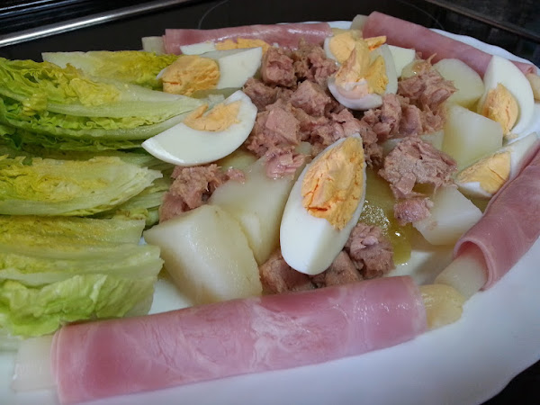 Añadimos el atún, los huevos cocidos y los espárragos envueltos con el jamón york.