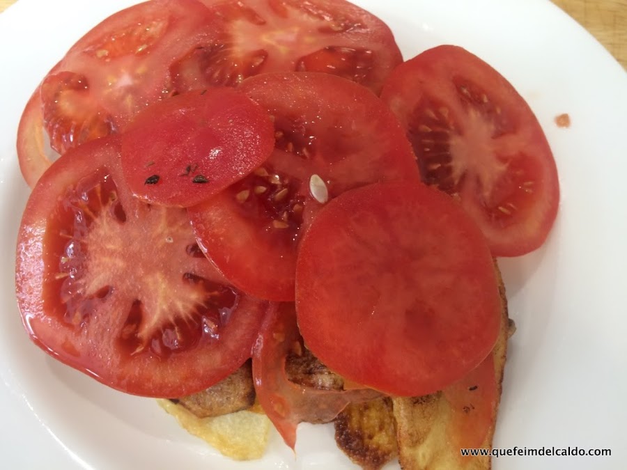 Sobre las patatas fritas ponemos el tomate cortado a rodajas.