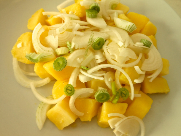 Aliña seguidamente las patatas y la cebolleta con la vinagreta removiendo bien para que ambos ingredientes se impregnen de ella.