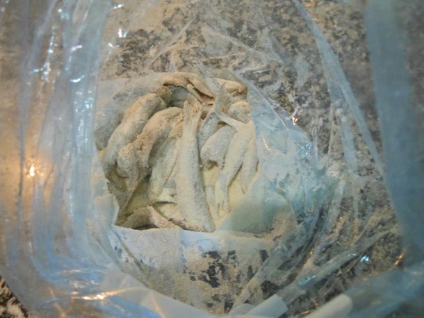 Cierra la bolsa y agítala suavemente hasta que todo el pescado esté impregnado de harina.