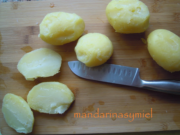 Cuando estén casi frías las patatas, quítales la piel y las cortas en rodajitas.