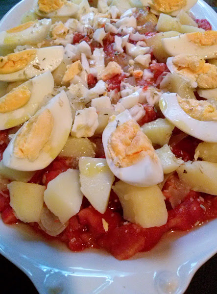 Ponlos en una fuente, pon las patatas encima y los huevos duros cortados en cuartos. Espolvorea orégano y aliña con la sal, aceite de oliva y vinagre .