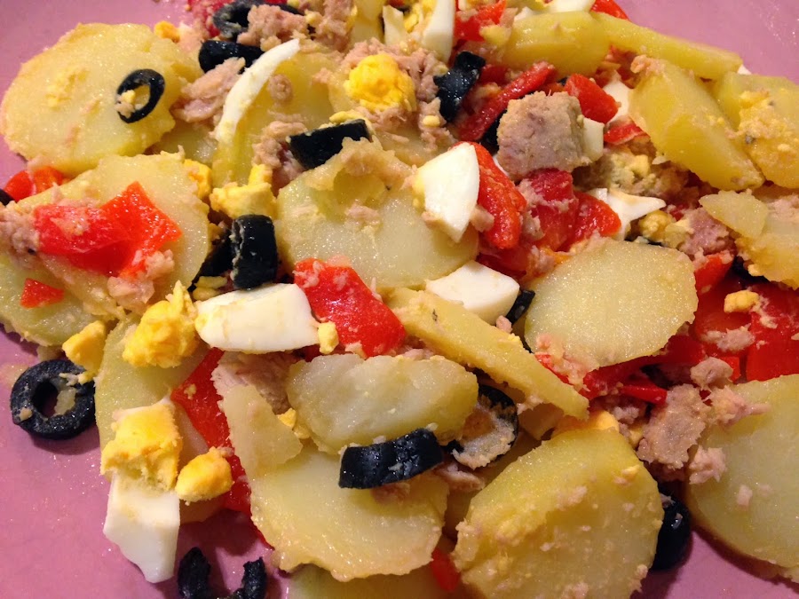 Cuando pensamos en ensaladas siempre nos viene a la cabeza la clásica ensalada verde con lechugas, tomate, espárragos blancos... Pero nos olvidamos que también podemos jugar con la pasta, el arroz, las legumbres, las patatas... Y prepararlas en forma de ensaladas bien fresquitas e ideales para disfrutar como plato único. Lo cierto es que hay infinidad de opciones y para gustos los colores. Yo en esta ocasión he preparado una ensaladita de patatas, como ingrediente principal, con atún en aceite, pimientos rojos, aceitunas negras y huevo duro.