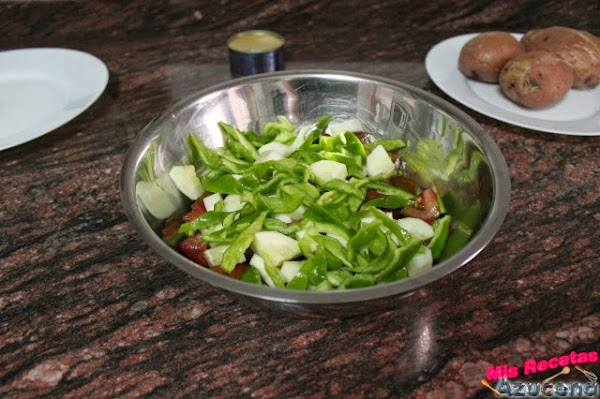 Por ultimo pelaremos las patatas y las picaremos para añadirlas al bol estando aun calientes para que tomen mejor los sabores.